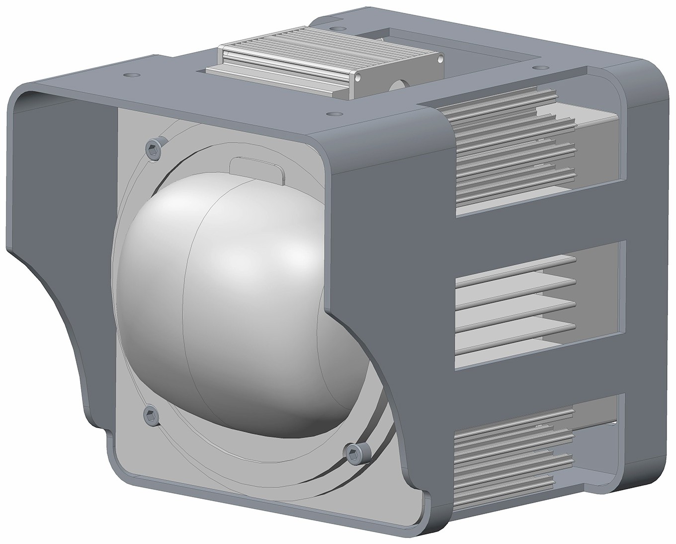 本外观设计产品名称为LED集渔灯,主要用于夜间捕鱼作业,设计要点在于产品整体造型,立体图最能表明设计要点。