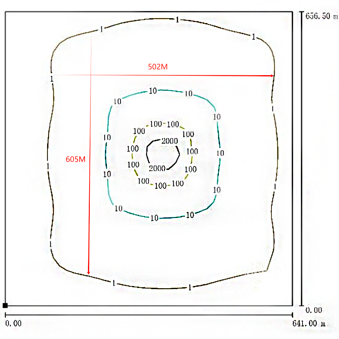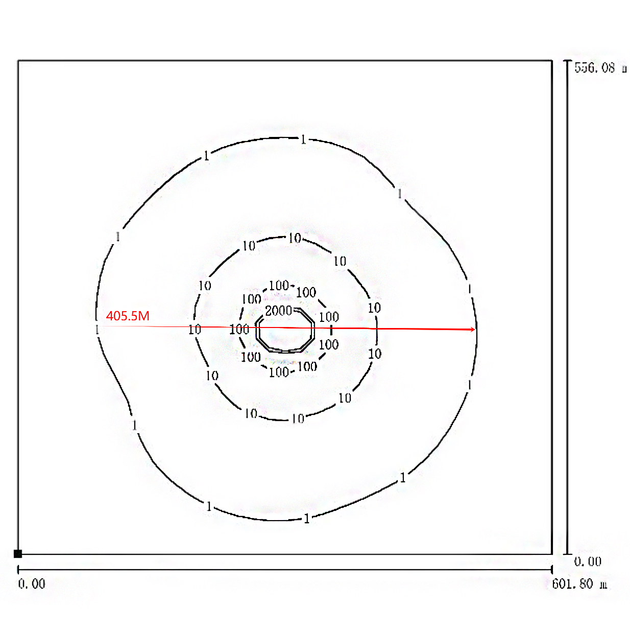 LED诱渔灯和金卤灯在440KW同功率时1 lux 的照射范围照度图。